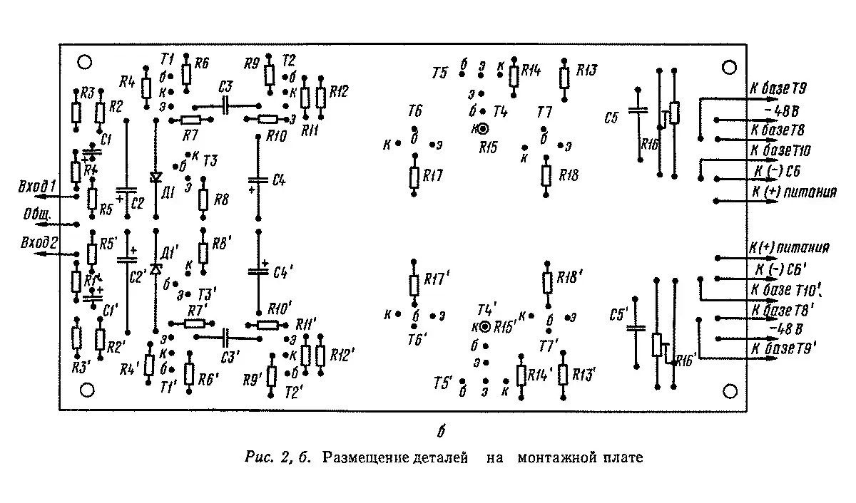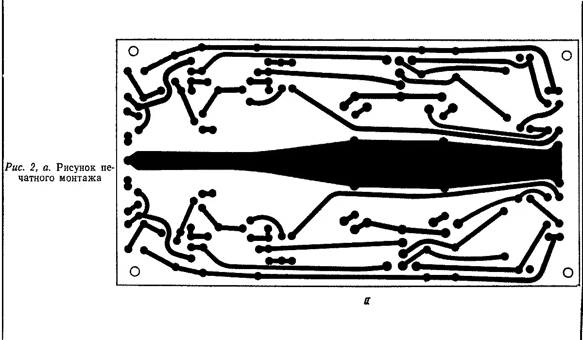Х90 мм (рис. 2), выполненной из фольгированного стеклотекстолита или гетинакса толщиной 1,5 мм. Выходные транзисторы Т9 и T10 установлены на металлических пластинах площадью по 300 см2, выполняющих роль радиаторов. Транзисторы предварительного усилителя работают при значительных мощностях рассеяния, поэтому они тоже снабжены радиаторами. Мощность, рассеиваемая на транзисторах T1, Т2, ТЗ, около 200 мВт. Радиаторы этих транзисторов изготовлены следующим образом. От латунной трубки с внутренним диаметром 8 мм (для транзисторов ГТ321) и 8,5 мм (для транзисторов МП42) отрезают кольца высотой 6 мм. Наружную поверхность кольца лудят, а затем из медной луженой проволоки толщиной 0,6 мм делают спираль с внутренним диаметром 6 мм. Этой спирали придают кольцеобразную форму — тор, внутренний диаметр которого должен быть несколько меньше наружного диаметра кольца. Тор надевают на кольцо и пропаивают по контуру. Готовый радиатор крепят на корпусе транзистора клеем.